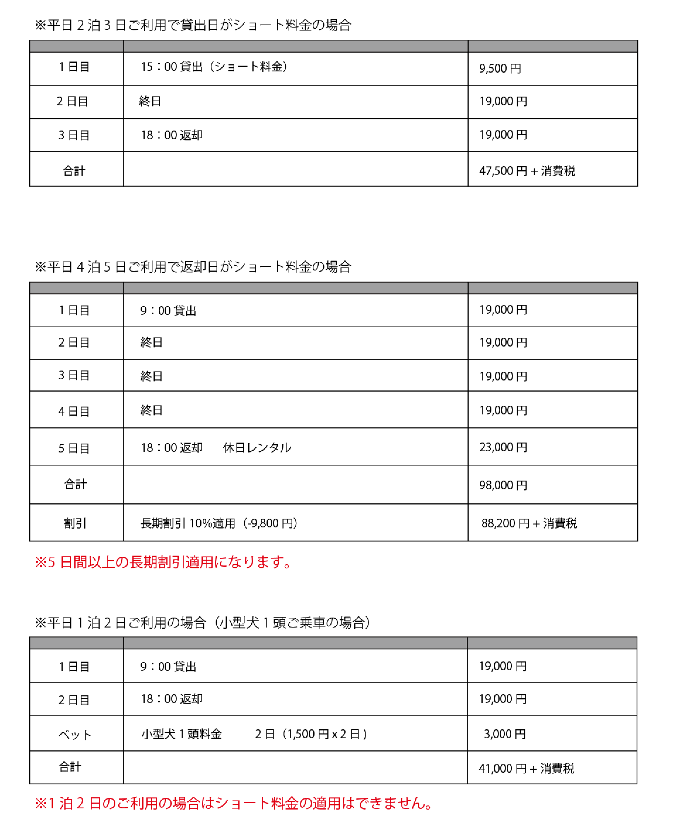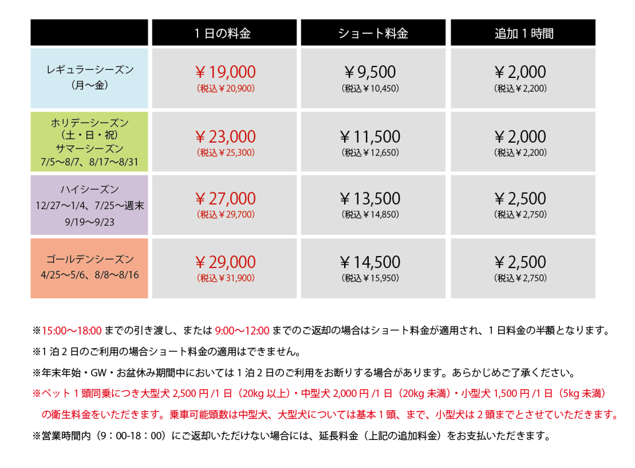 ※ペット1頭同乗1日につき大型犬2,500円(20kg以上)・中型犬2,000円(20kg未満)・小型犬1,500円(5kg未満)の衛生料金をいただきます。乗車可能頭数は小型犬まで2頭、中型犬、大型犬については基本1頭とさせていただきます。